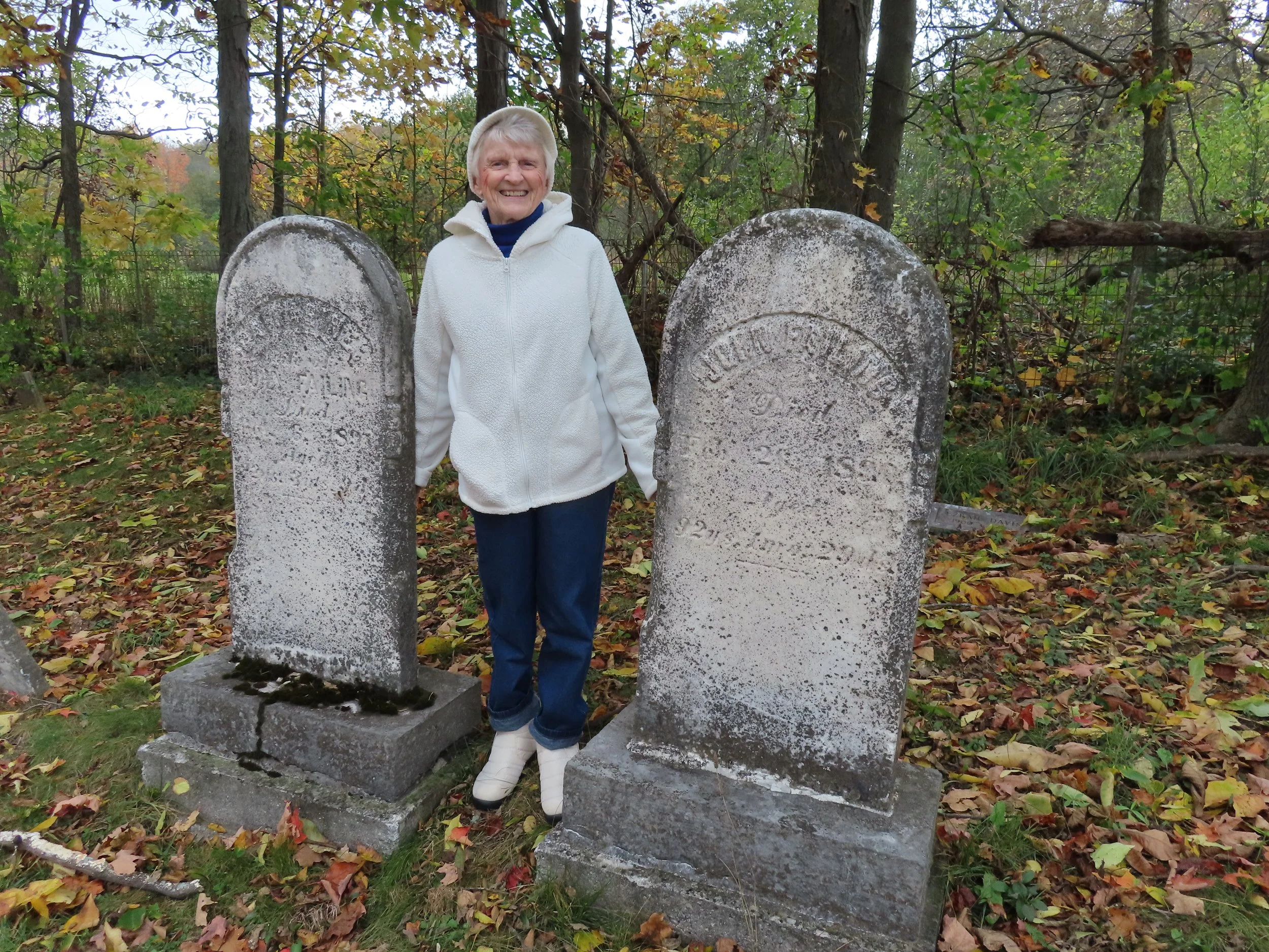 Esther at the Parrish Cemetery graves of her 3x great-grand parents, John (1797-1890) and Catherine (1799-1891) Failing